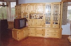 Wohnzimmerschrank aus Fichtenholz massiv mit angebautem und in Erker eingebauten Schreibplatz. Fernsehschrank mit 380 Grad drehbaren Fernsehauszug